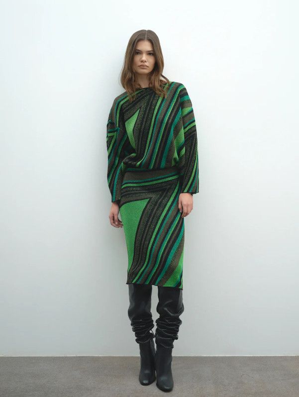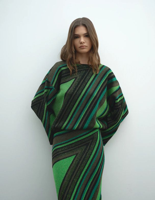 Maglia giracollo dal design moderno con riga diagonale a contrasto arricchita da filati in lurex per un tocco luminoso e sofisticato.La lavorazione dinamica dona movimento alla silhouette,mentre il fit regolare la rende comoda e versatile.Perfetta per aggiungere un dettaglio brillante ai look quotidiani.